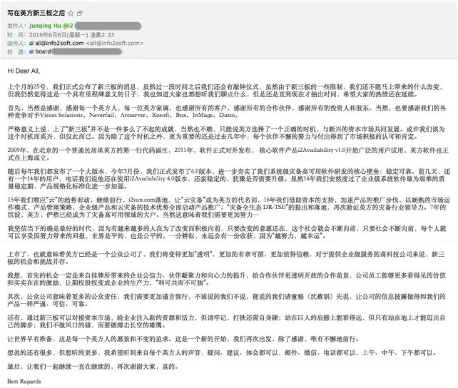 自5月25日英方对外公布登陆“新三板”的消息之后,英方获得了来自用户、投资者、媒体的多方关注,6月6日,英方股份CEO胡军擎发布了一封内部公开信,信中对“新三板”以及“新三板”之后英方的未来发展等大家关心的问题做了相关说明。