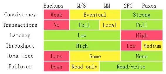 这个图基本上来说是目前高可用系统中能看得到的所有的解决方案的基础了。M/S、MM 实现起来不难,但是会有很多问题,2PC的问题就是性能不行,而Paxos的问题就是太复杂,实现难度太大。