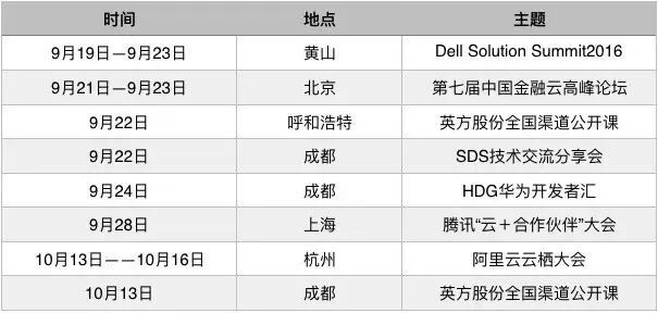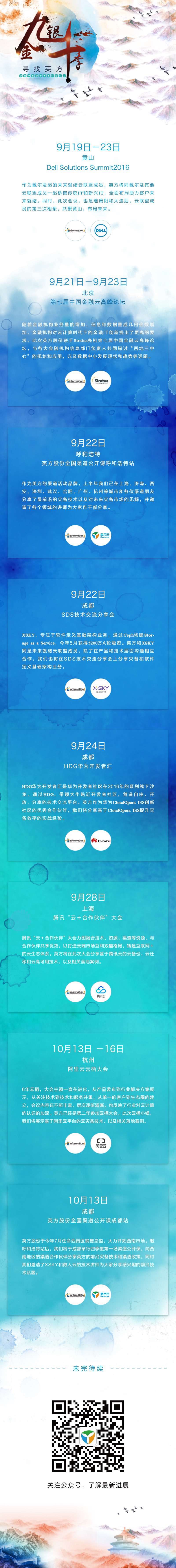 秋天,是个收获的季节,英方将携手戴尔、华为、阿里云、腾讯云、Stratus、XSKY、数人云等众多合作伙伴一道在黄山、北京、呼和浩特、成都、上海、杭州等地为大家带来多场精彩活动,这里有最丰富的解决方案,有最前沿的技术实践,有最健康的合作生态。