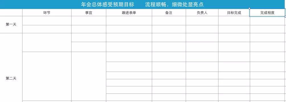 从员工定机票、火车票开始,到落地接机、接车,直到送员工安全返程,每个环节、相应的事宜、对应的跟进表单、备注、负责人、目标完成时间、完成程度,等等。对年会的整个议程了然于心。