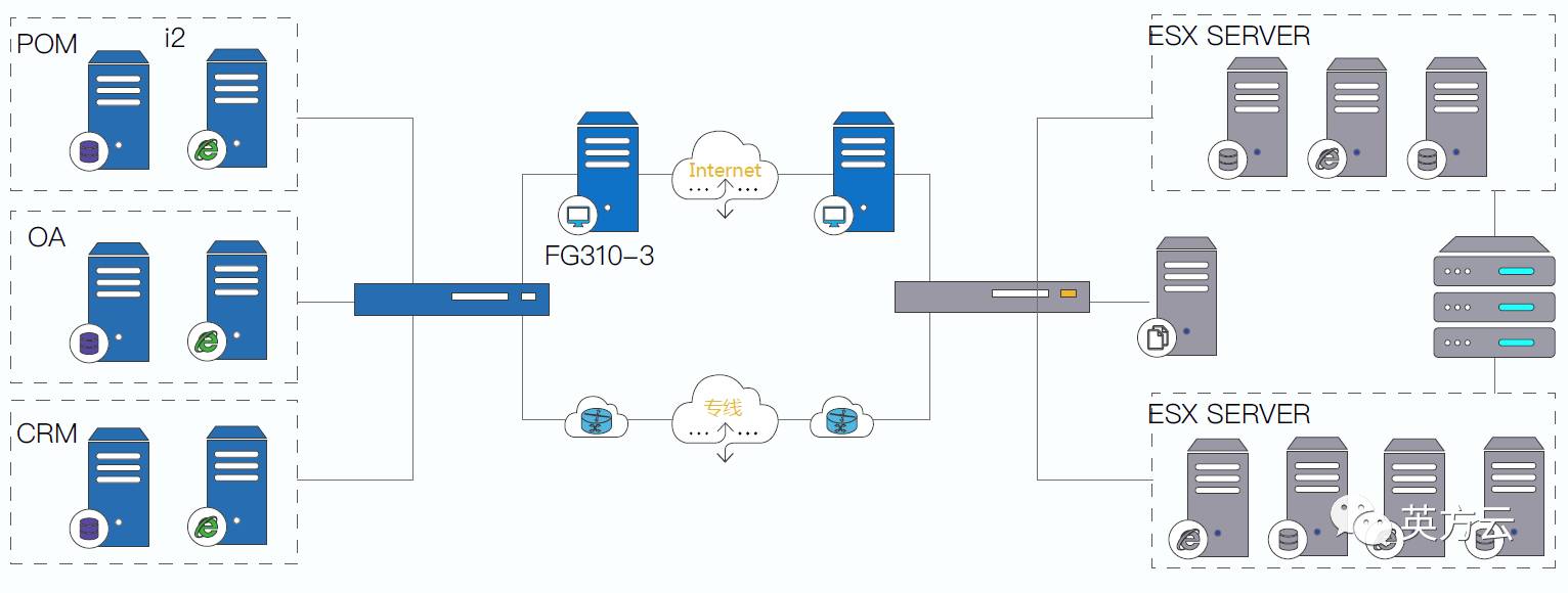经过英方工程师前期专业的环境调研,评估该地产集团的应用为典型的企业内部应用系统,涉及到OA、CRM、POM三个系统,底层的数据库主要是SQLserver,并且对外提供WEB访问服务。