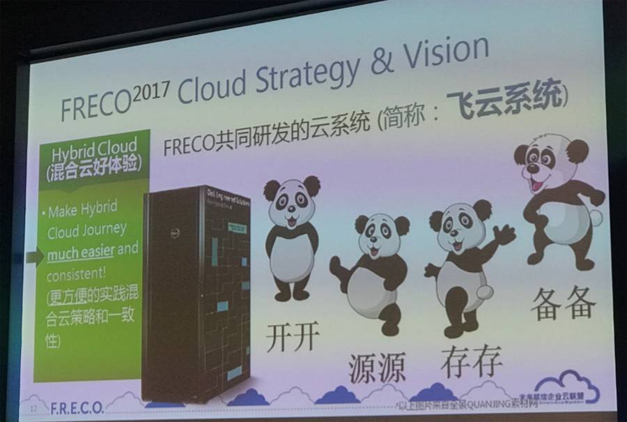 戴尔全球资深副总裁、大中华区总裁黄陈宏博士在主会场演讲时称赞FRECO云联盟,并向现场嘉宾介绍:2016年5月,在贵阳数博会上,戴尔携手东软、FIT2CLOUD、航天云宏、Pivotal、UnitedStack有云、VMware、XSKY、英方、YottaCLOUD优特云等多家企业成立了“未来就绪企业云联盟”。戴尔与联盟成员在混合云解决方案上不断推陈出新,打造全栈式混合云解决方案,建立跨云服务体系,促进各行业的混合云快速落地,并共同研发了“飞云系统”——开开、源源、存存、备备、欣欣等五大解决方案。