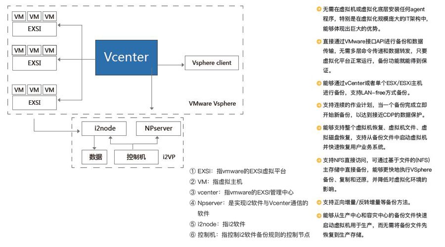虚拟机无代理保护:通过Vmware虚拟化的API接口,实现虚拟机的底层传输,确保备份后的虚拟机可恢复。