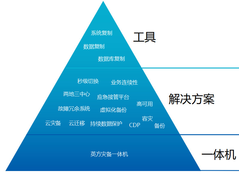 为了让区域伙伴对英方灾备产品的理解更加有层次感,我们可以将这些产品归纳为金字塔状的表现形式,如下图。