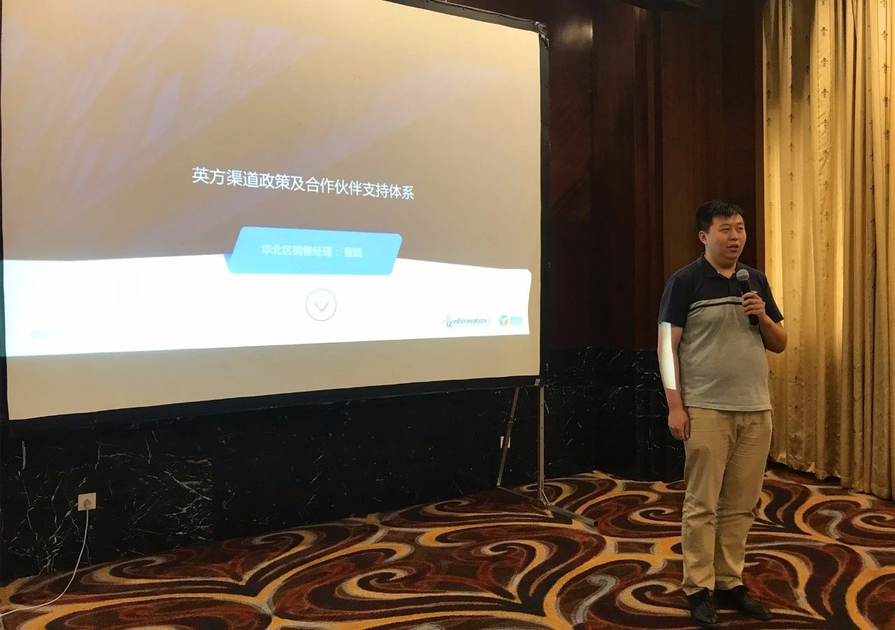英方华北区销售经理董超从渠道政策方面,介绍了英方在渠道体系建设、奖励机制、分销机制等方面的内容,对相关方的职责和能力进行确认,以实现双方携手合作共赢的愿景。