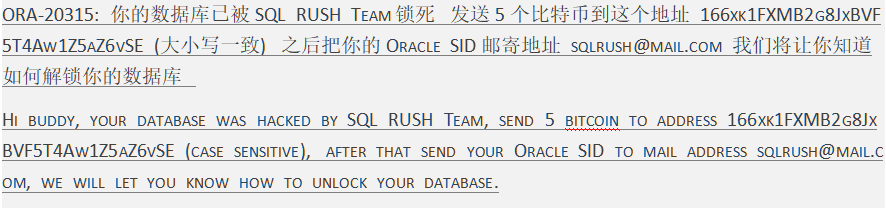 这绝非危言耸听,下面这位用户的Oracle数据库被恶意锁死时,就出现了下面的缴纳赎金的提示: