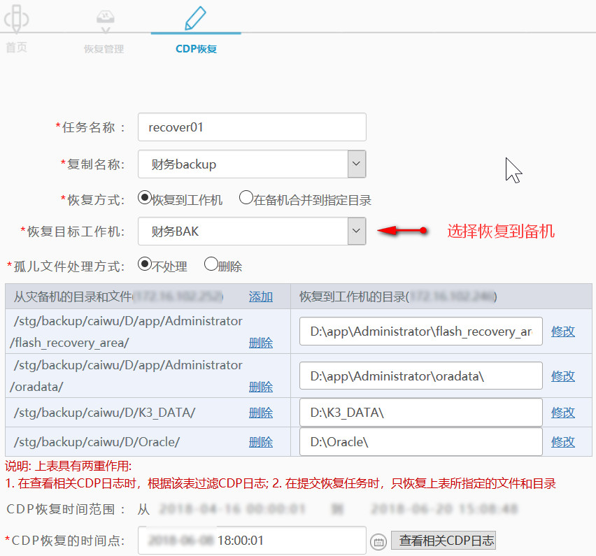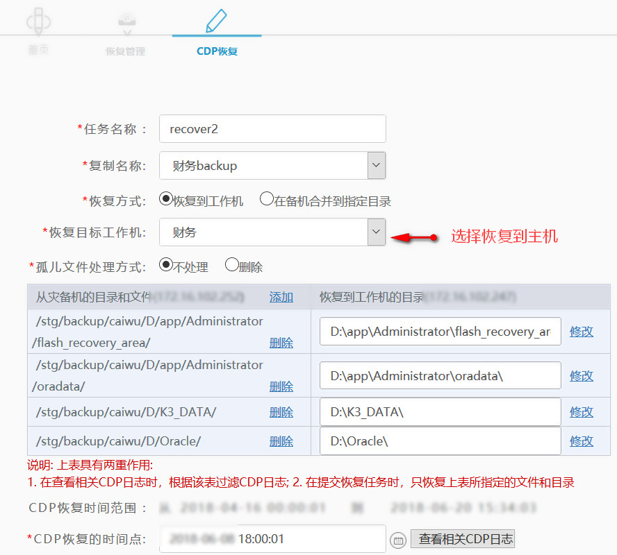 这是因为期间并未有新的数据写入备机,所以直接选择从CDP备份恢复更方便。如果备机接管业务后有新的数据写入,就需要将备机的当前数据恢复到主机。如下图。