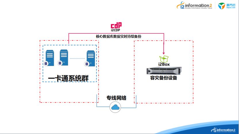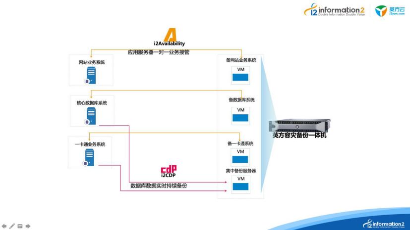 通过i2Availability进行应用服务器一对一业务接管,实现当生产业务系统出现问题,备份的业务系统可以快速接管生产业务系统的相关服务。同时,通过i2CDP对现有核心数据库业务进行CDP保护,确保数据安全性提升数据和整个应用灾备和系统的灾备保护等级。