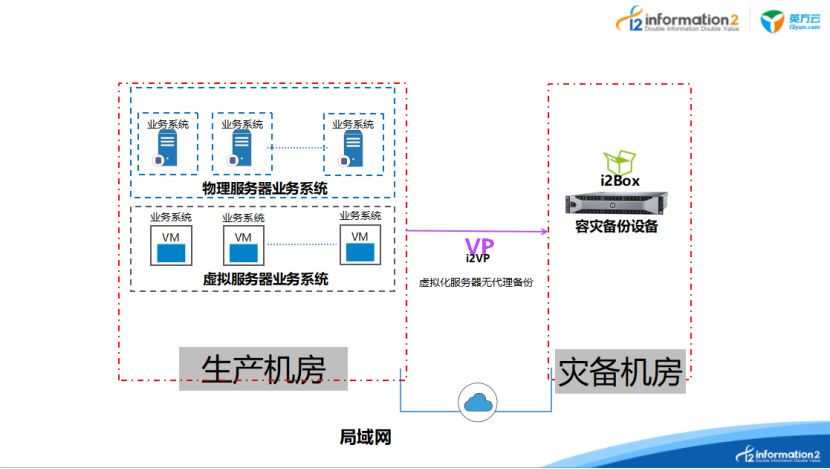 针对目前虚拟化平台业务系统,通过在本地机房部署一台英方容灾备份一体机。通过i2VP虚拟化无代理备份产品对运行在虚拟化平台的虚拟服务器进行定时的无代理备份保护。
