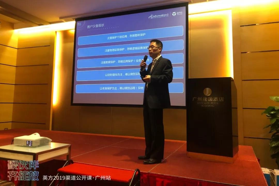 在会议的开始,英方华南销售总监李海的分享《新时代的灾备生意经》包含了诸多他对新时代灾备的看法。首先,结合了目前市场的情况,和IDC的数据,李海认为,灾备的市场和其潜力是巨大的,这无疑为我们的行业发展提供了一个良好的环境和极大的助力。但是,随着数据的增多,层出不穷的勒索病毒和其他一切对数据造成威胁的意外或人为的突发事件,也迫使我们要更加注重数据安全和数据保护。“没有绝对安全的系统和平台,而风险也并非不存在,只是没有发生。”结合最近正在召开的两会,李海指出,国家也在注重数据安全,并在加大数据安全的立法力度。种种的情况和迹象都在告诉我们,无论是大环境,还是社会条件,都在促使灾备行业稳健发展。而抓住这个机会,才能让我们在时代的浪潮中收获成功。而多年来致力于灾备行业的英方,无论从产品,还是解决方案,都在寻求不断的升级和迭代。