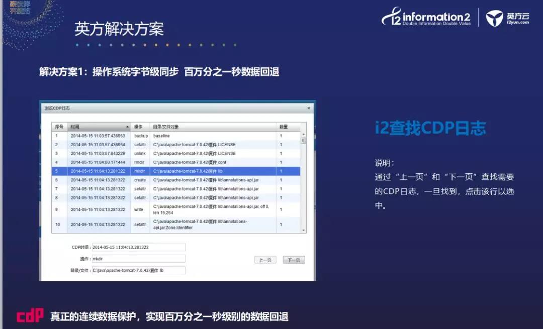 在解决方案上,李海也进行了详细的分享。首先是操作系统的字节级同步,可以无惧勒索病毒。英方自主研发的字节级复制技术和i2CDP这款产品,都可以让勒索病毒无处遁形,并且可以实现百万分之一秒级别的数据回退。