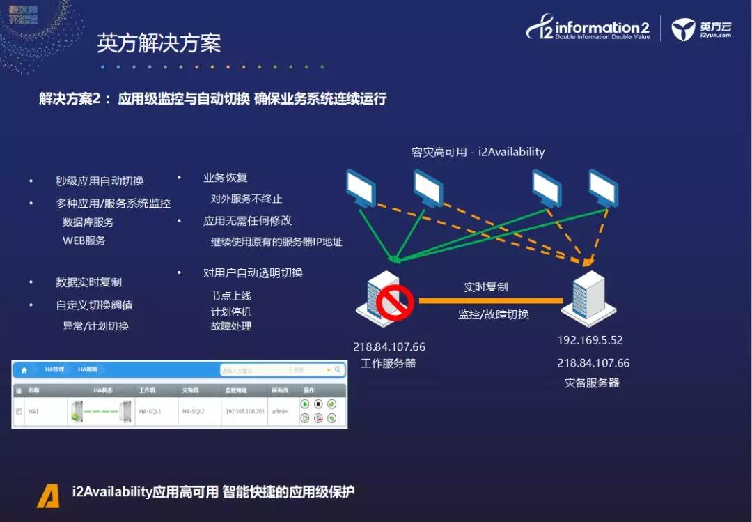 其次,是应用级监控与自动切换,i2Availability可以确保业务系统连续运行。i2Availability应用高可用,可以为客户提供智能快捷的应用级保护。当工作机因为人为或其他的原因不可用时,i2Availability可以自动切换到灾备机上,做到真正的秒级切换,业务不断。