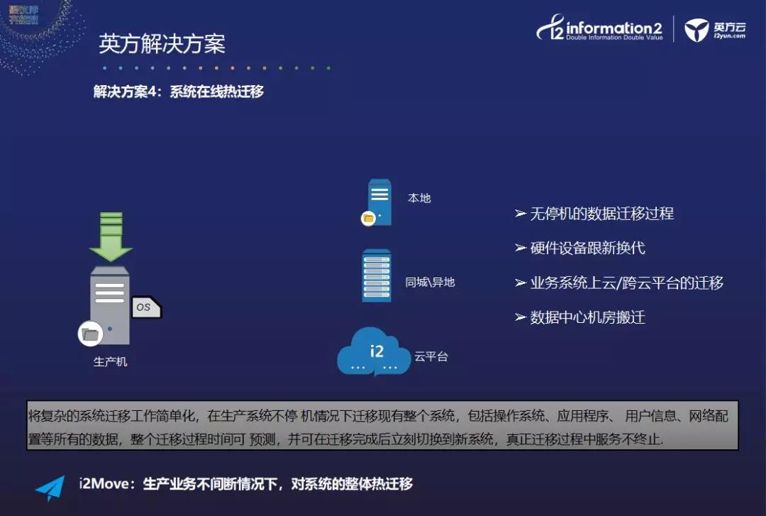 最后,英方的在线热迁移也是英方的王牌解决方案之一。英方自主研发的i2Move可以将复杂的系统迁移工作简单化。在生产系统不停机情况下迁移现有整个系统,包括操作系统、应用程序、用户信息、网络配置等所有的数据。整个迁移过程时间可预测,并可在迁移完成后立刻切换到新系统,真正迁移过程中服务不终止。