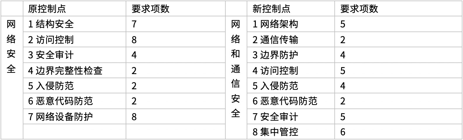 调整后减少了结构安全、边界完整性检查、网络设备防护三个控制点,增加了网络架构、通信传输、边界防护、集中管控四个控制点。