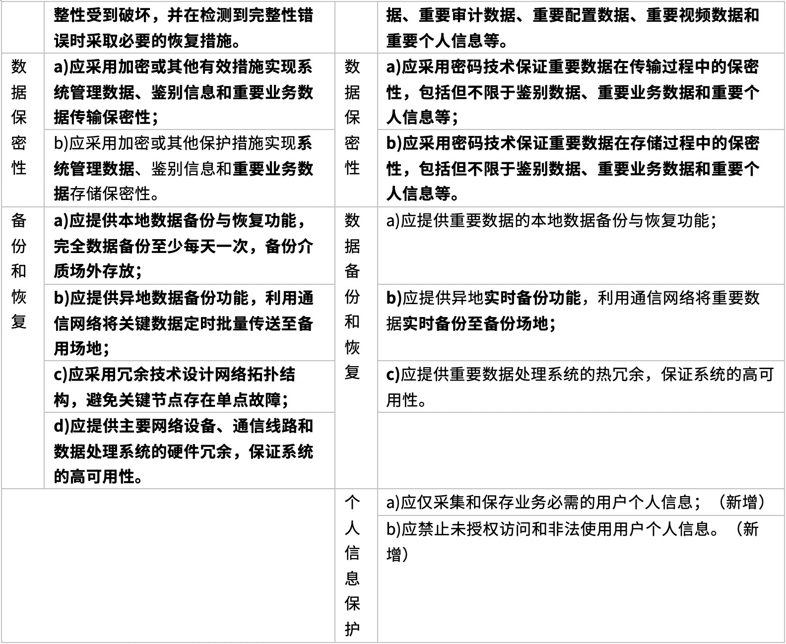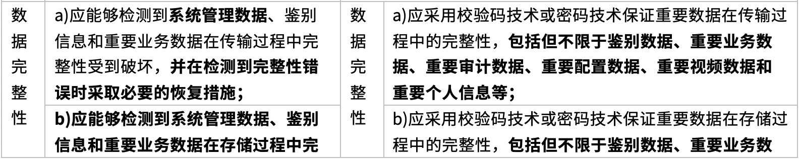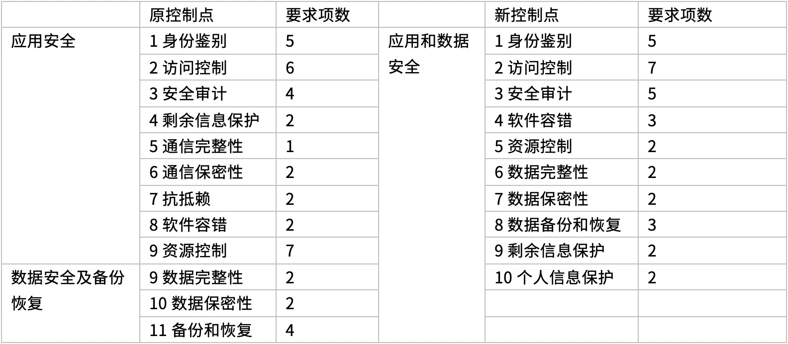 要求项总数原来为39项,调整后为33项。将应用安全、数据安全及备份恢复两个层面合并成了应用和数据安全一个层面,减少了通信完整性、通信保密性和抗抵赖三个控制点,通信完整性和通信保密性的要求纳入了网络和通信安全层面的通信传输控制点,值得一提的是,备份与恢复正式纳入了数据安全行列。