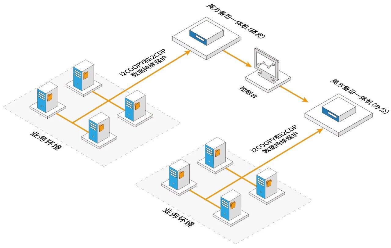 • 备份服务器为CDP灾备一体机,对所有业务系统服务器数据进行实时备份,对生产系统数据实现i2CDP持续数据保护,实现对历史数据的任意回溯保护和应用高可用防护。备份一体机上部署控制虚拟机,控制虚拟机中安装英方服务器端模块,实时接收生产服务器上发送过来的数据,异常情形时,提供数据即时恢复服务。