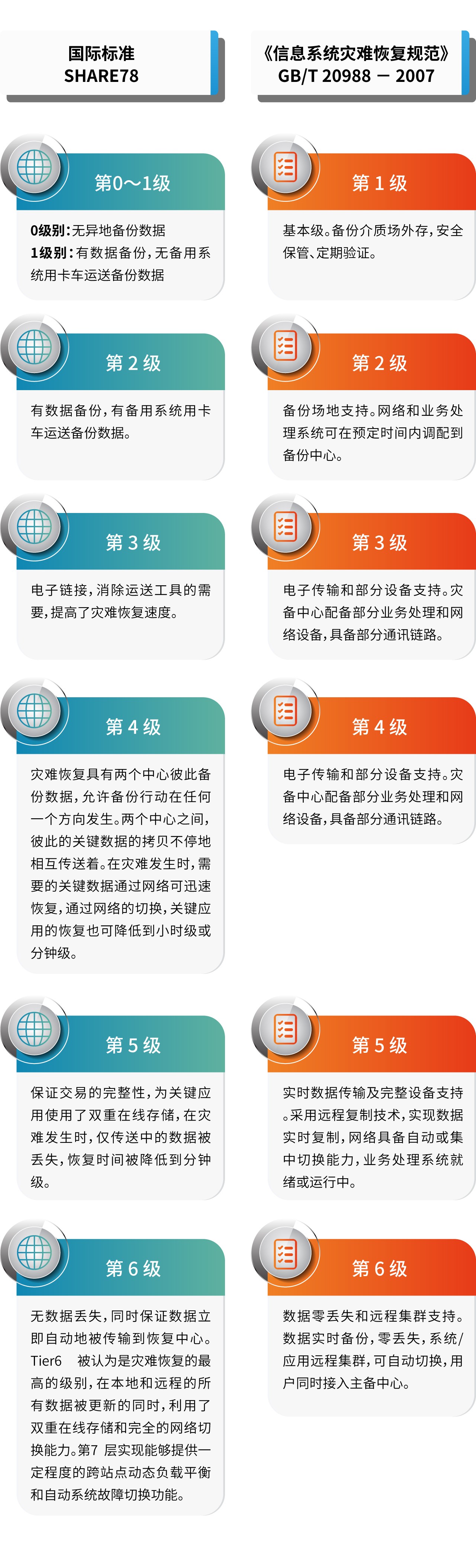 其中,灾难恢复规划是一个周而复始、持续改进的过程。在这个过程中,我国灾难备份与恢复行业的第一个国家标准——《信息系统灾难恢复规范》 (GBT20988-2007)对灾难的恢复能力进行了等级的划分。该标准规定了信息系统灾难恢复应遵循的基本要求,适用于信息系统灾难恢复的规划、审批、实施和管理,并参照国际标准SHARE78的7个层级定义来规范标准。