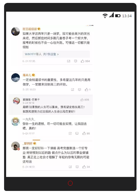 同月,在一条讨论放假的微博下,一个学生的“高三党还要继续补课,只能放半天假,知足吧,你们至少还有假期,最痛苦的还是我们。”也得到了上千条回复,其中点赞最高的说:“再过几年你就会知道,读书的苦真的不算什么。”