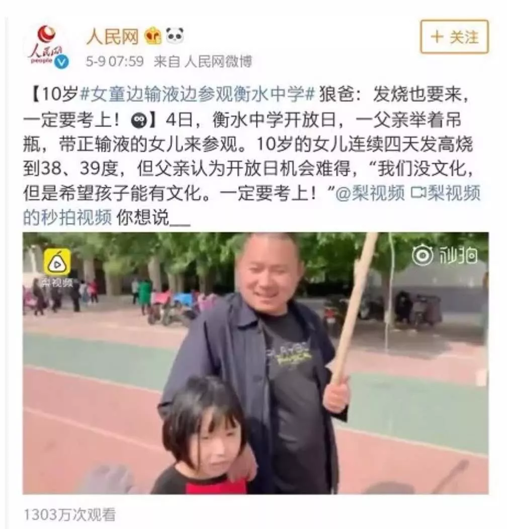 前段时间,衡水中学频上热搜,令这所“高考工厂”成为热议的焦点。在衡中开放日那天,一位父亲带着十岁的女儿前来参观。小女孩打着吊瓶,连续发高烧到38度,但父亲还是想趁此难得的机会,让孩子提前感受下高考的氛围。