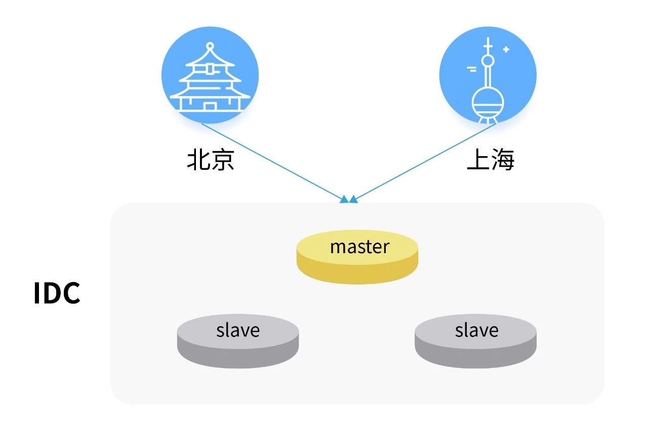 为了解决这些问题,我们可以将服务部署到多个不同的IDC中,不同IDC之间的数据互相进行同步。如下图: