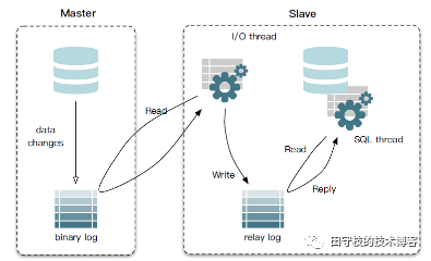 通常一个mysql集群有一主多从构成。用户的数据都是写入主库Master,Master将数据写入到本地二进制日志binary log中。从库Slave启动一个IO线程(I/O Thread)从主从同步binlog,写入到本地的relay log中,同时slave还会启动一个SQL Thread,读取本地的relay log,写入到本地,从而实现数据同步。