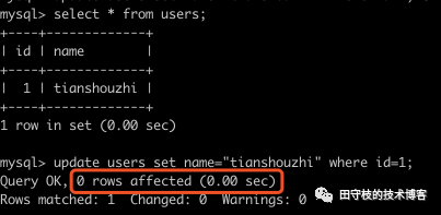 上图演示了,数据中原本有一条记录(1,"tianshouzhi”),之后执行一个update语句,将id=1的记录的name值再次更新为”tianshouzhi”,意味着值并没有变更。这个时候,我们看到mysql 返回的影响的记录函数为0,也就是说,并不会产生真是的更新操作。