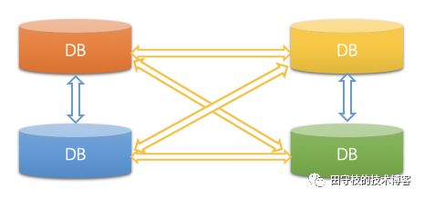 前面的架构中,只涉及到2个DB的数据同步,如果有多个DB数据需要相互同步的情况下,架构将会变得非常复杂。例如: