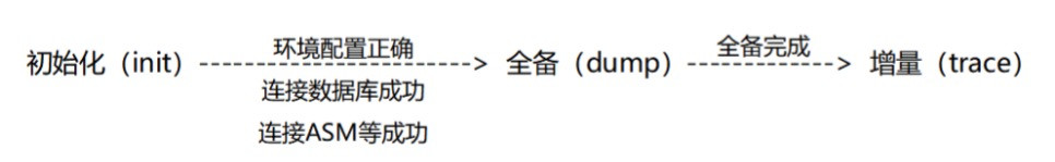 数据库语义级的实时数据同步,在数据库正常使用时,自动完成源端到备端数据的初始化全量复制,并实时监控及同步复制增量数据,其正常流程的状态转换及条件如下:
