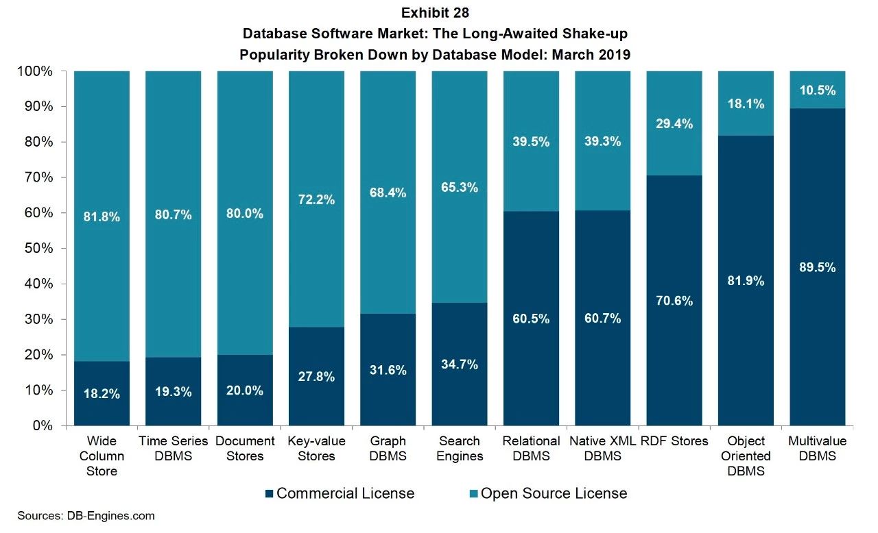 Wide Cloumn:开源占比81.8%;时序数据库:开源占比80.7%;文档存储:开源占比80.0%;Key-Value存储:开源占比72.2%;图数据库:开源占比68.4%;搜索引擎:开源占比65.3%