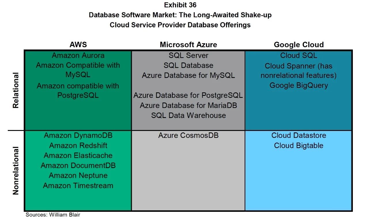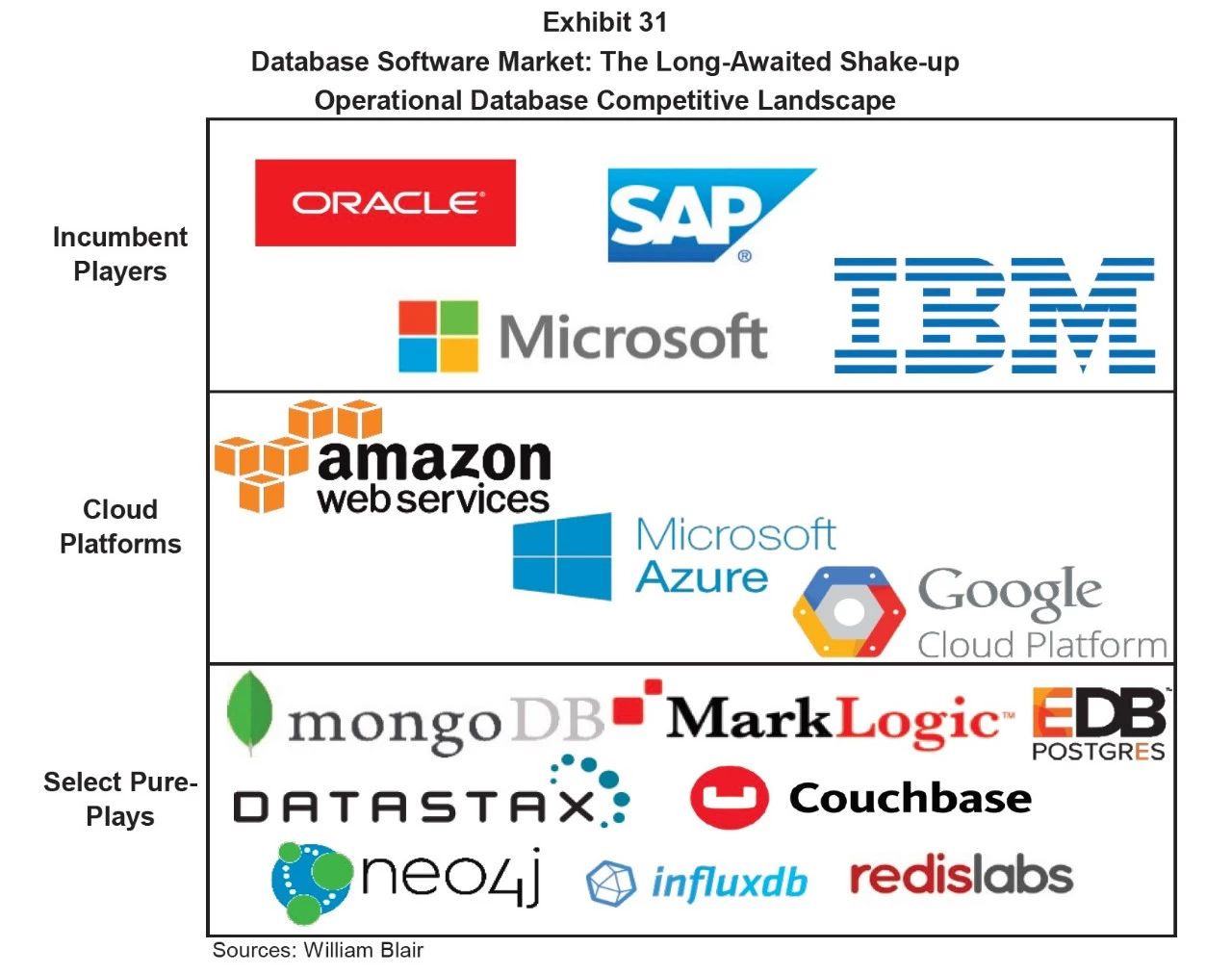 交易型数据库的4个巨头仍然是Oracle、微软、IBM和SAP,在这里William Blair将他们归为第一阵营。