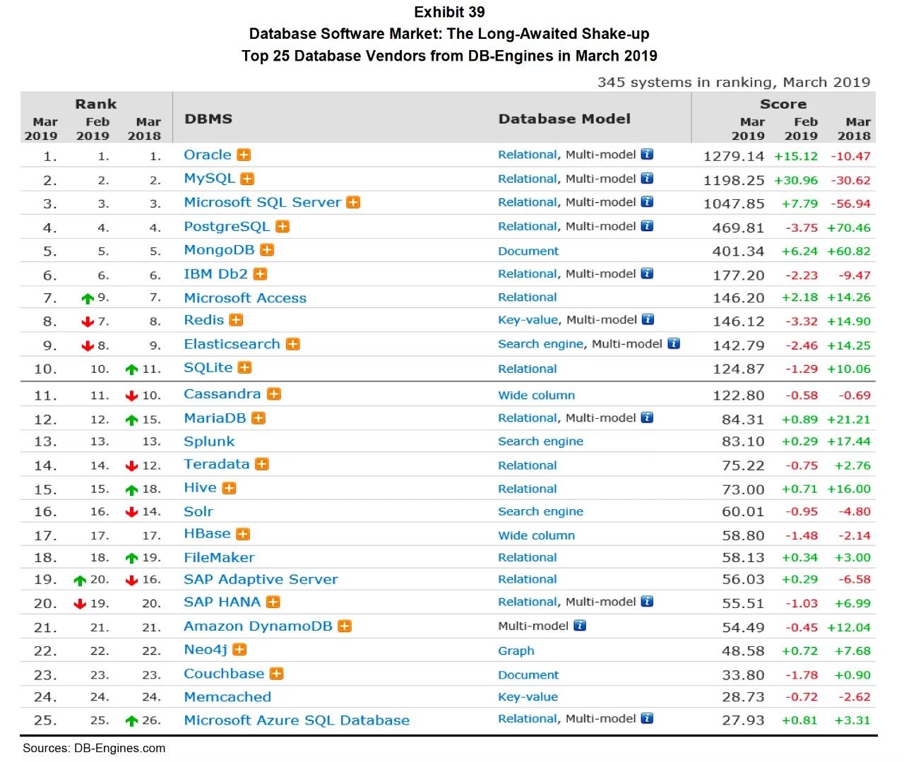 代表非关系型数据库的DDMS分类中(这里同样加入Hadoop等),云服务和新兴厂商成为了主导,微软应该是因为云SQL Server的基础而小幅领先于AWS,这两家一共占据超过50%的市场,接下来的排名是Google、Cloudera和Hortonworks(二者加起来13%)。
