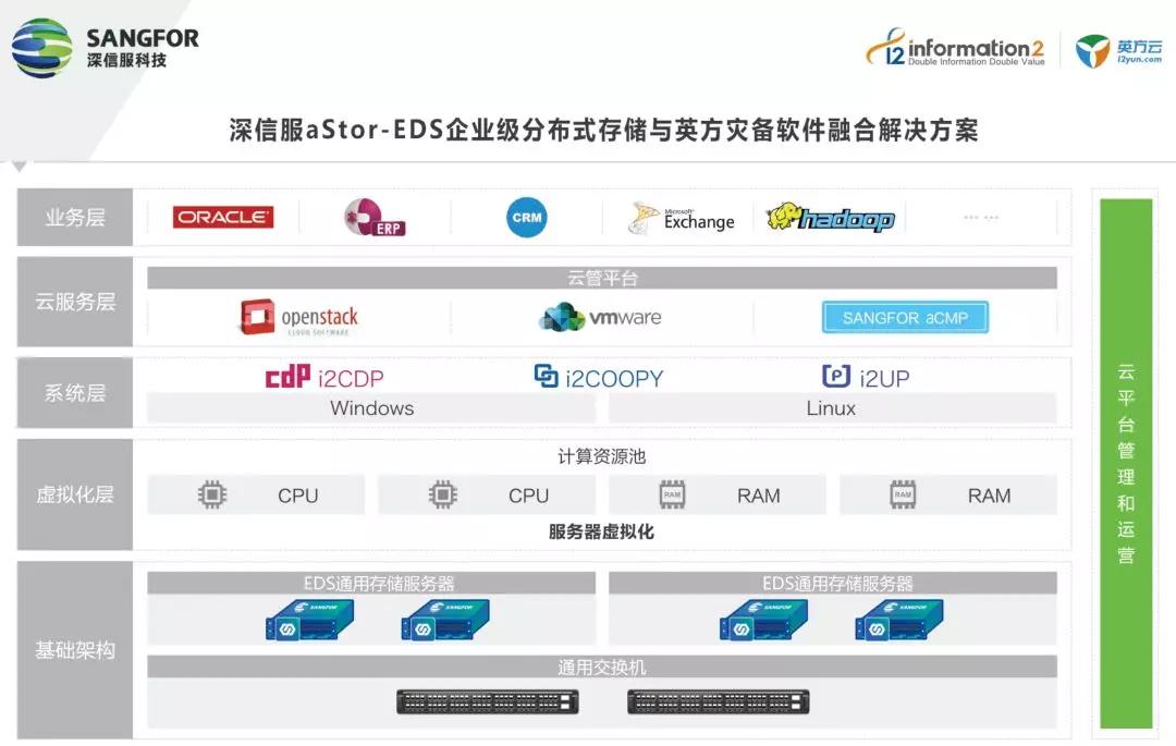 为了解决这个问题,英方与深信服深入合作,英方的i2COOPY、i2CDP、i2UP等软件与深信服的aStor-EDS存储系统进行融合。由于英方的灾备软件是基于操作系统层面,不依赖于底层存储,进而可以通过SDS的兼容实现分布式存储的数据恢复和高可用保护。