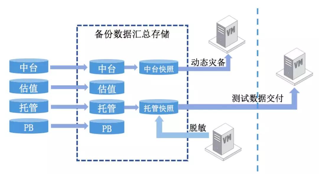 基本上要交付一套测试数据,周期在7到8小时以上。新的方法是当开发提出要测试数据时,可以对已经存在的托管的黑石数据进行存储快照,把它挂在脱敏服务器上直接脱敏,脱敏之后可以通过存储的卸载、挂载放到规定的测试机上,这样就从七八个小时压缩到了一个小时了;第二,这种架构也可以对接云管平台,在启用灾备时动态划分资源,实现动态资源灾备的作用。