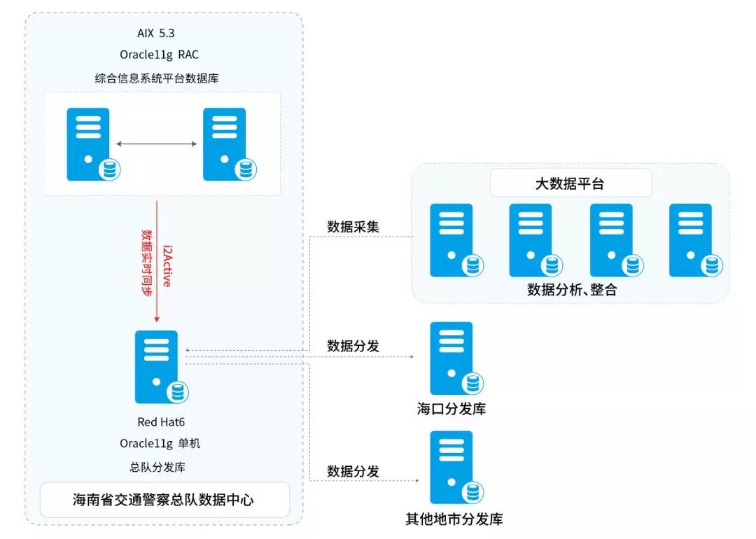 由于越来越多的系统需要接入综合管理平台读取数据,考虑到未来系统的多样性和复杂性以及数据库承载压力的能力,为对综合平台数据库的数据读取压力进行分摊,海南省交通警察总队联合英方共同通过i2Active落地了其核心数据库数据同步项目,并于近期全面上线。通过英方i2Active实现数据库的读写分离,保障生产库正常有序地运行。英方i2Active基于redo log日志分析技术,将综合信息系统平台数据库中资料数据实时同步到总队分发库中,以便实时向其他区域分发库提供数据,从而减少各地分库对综合信息系统平台数据库的读取压力,有效提升生产库的性能。