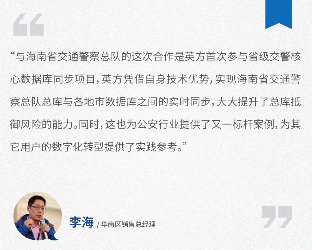 作为海南省的一级数据库,为建设适合各地市、各级公安交管部门使用的通用查询统计、短信发送等系统提供数据基础。与英方共同落地的数据库数据同步项目,大大缓解了海南省交通警察总队生产库的压力,为海南省全省交警各业务系统正常开展工作提供安全保障。