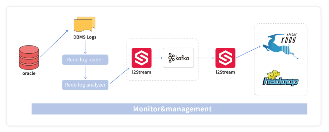 图3是关系型数据库Oracle到Kudu的数据抽取→转换→转载的过程,先通过数据库复制产品i2Active将源端数据库的结构化数据解析、提取后, 通过i2Stream进行对接、转换,并发送给消息队列,最终写入HDFS。在此基础上将数据同步到Kudu/HBase等数据仓库。