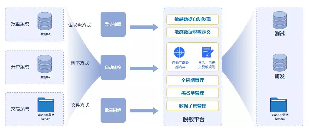 静态脱敏是将数据抽取进行脱敏处理后,再下发至非生产环节,以保障开发、测试、培训、分析人员可以随意取用测试数据,并进行读写操作。脱敏后的数据与生产环境相互隔离,在满足测试环节所需的情况下,还能保障生产数据安全。