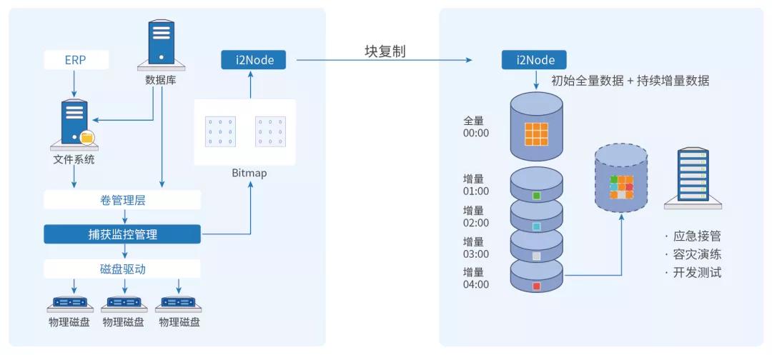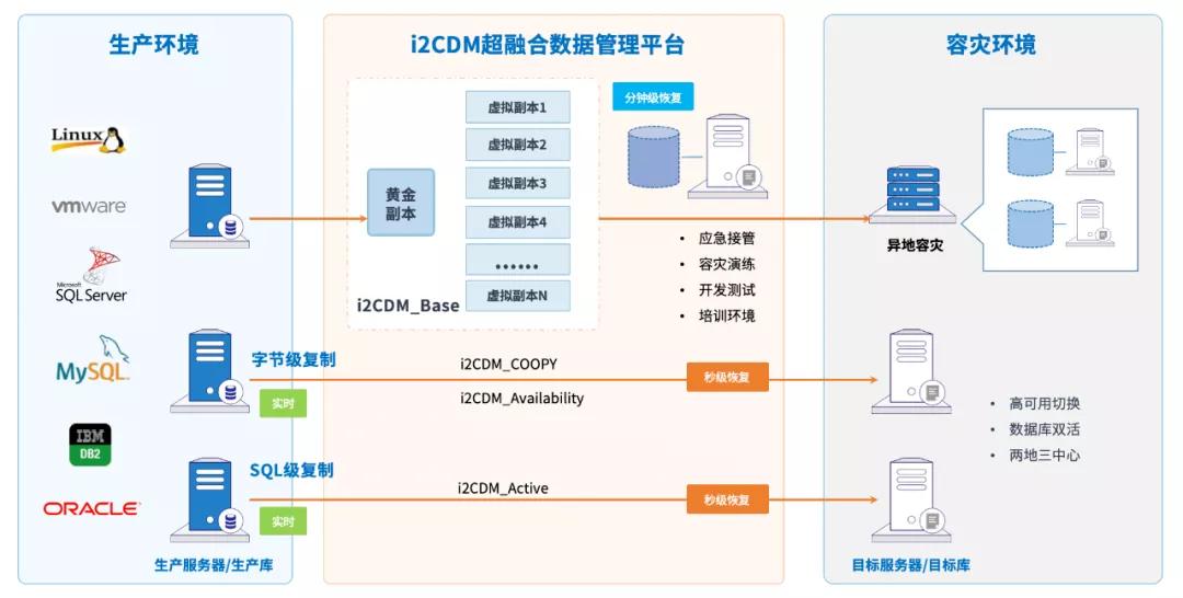 英方软件基于多年的数据备份、容灾和数据管理经验,推出了 i2CDM 副本数据管理平台方案,通过建立一个完整的整机系统副本拷贝,实现生产主机数据或系统更新时,进行数据块级别的实时变化同步。i2CDM 副本数据支持整机的容灾接管、生产测试开发、自动化容灾演练等功能。此外,根据用户的需求,可以实现整机副本数据支持快照功能进行历史整机的恢复。