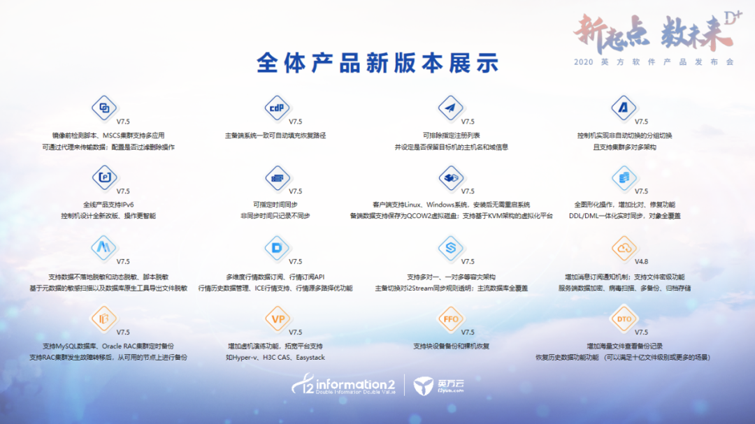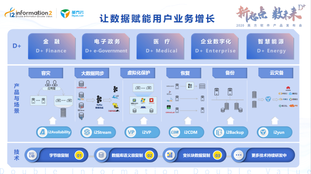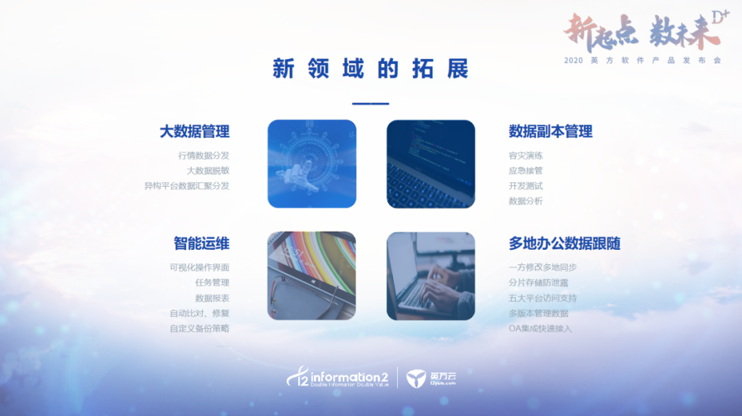 10 月 23 日,领先的数据复制基础软件企业英方软件,成功举办以“ D+ 新起点·数未来”为主题的“ 2020 英方软件产品发布会”。除了发布“大数据管理、数据副本管理、智能运维、多地办公数据跟随”等新领域成果,英方软件在过去 10 年数据复制核心技术和产品的基础上,提出围绕不同行业用户的数据保护、管理和业务需求,以 Data+ 为用户提供个性化服务的新战略。