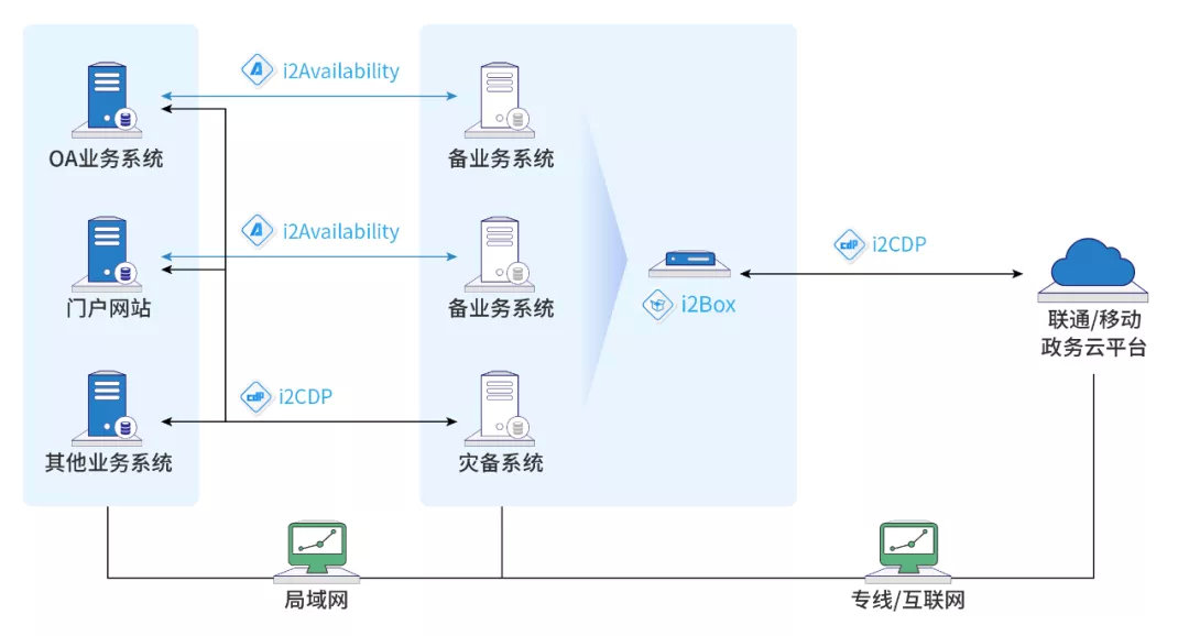 首先,通过 i2Availability 对 OA 业务系统、门户网站做业务级高可用保护,当本地业务系统出现各种异常(如服务异常停止、网络异常、硬件故障、生产系统宕机维护)而导致应用系统不可用时,应用系统能够自动或手动切换至容灾设备上。