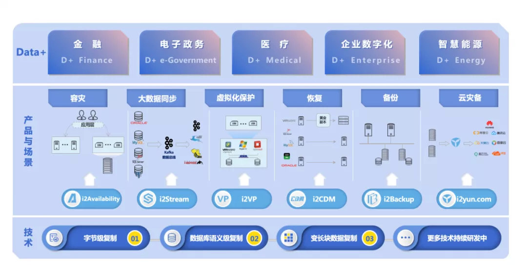 如何将 Data+ 在具体的应用中落地,英方就不同场景下的数字化需求,研发了相应的软件产品,如数据实时灾备 i2COOPY、数据流复制管理 i2Stream、结构化数据同步 i2Active、持续数据保护 i2CDP、应用高可用 i2Availability、在线热迁移 i2Move、虚拟化备份 i2VP等,能够切合用户需求,打造多层次、多策略、全域的解决方案。